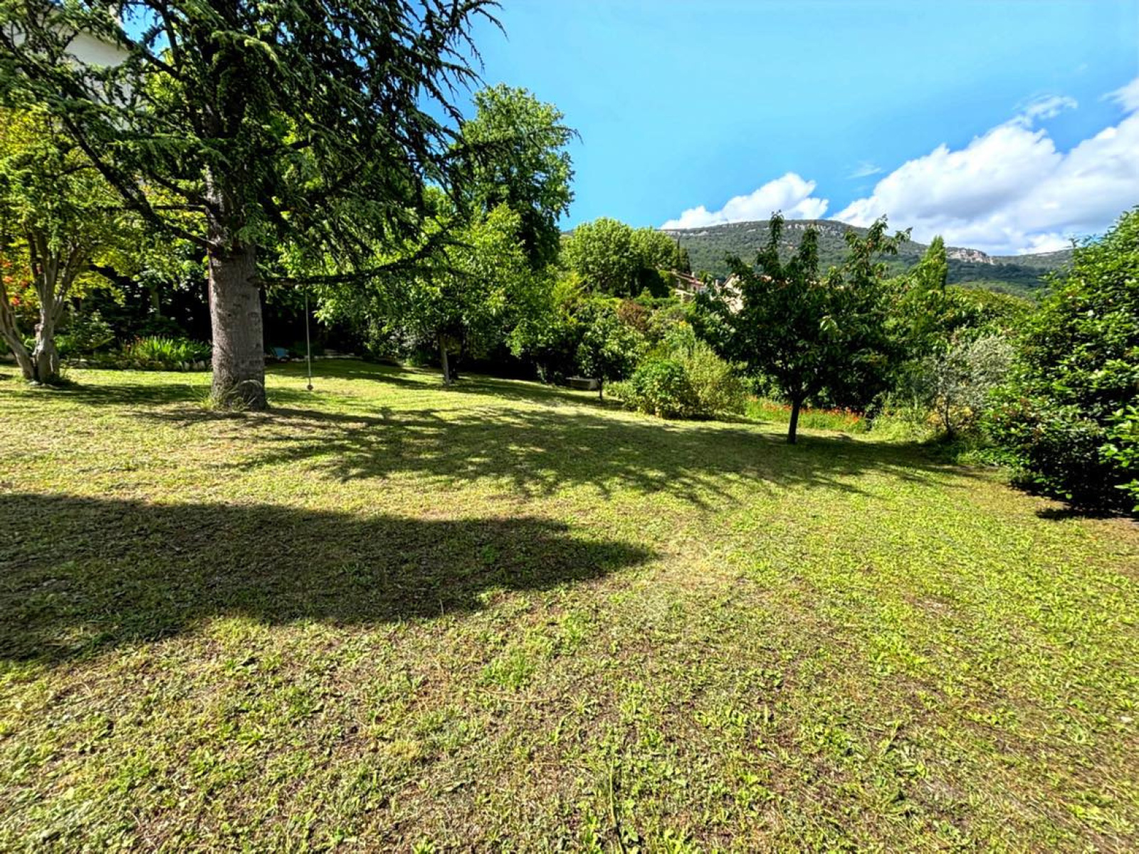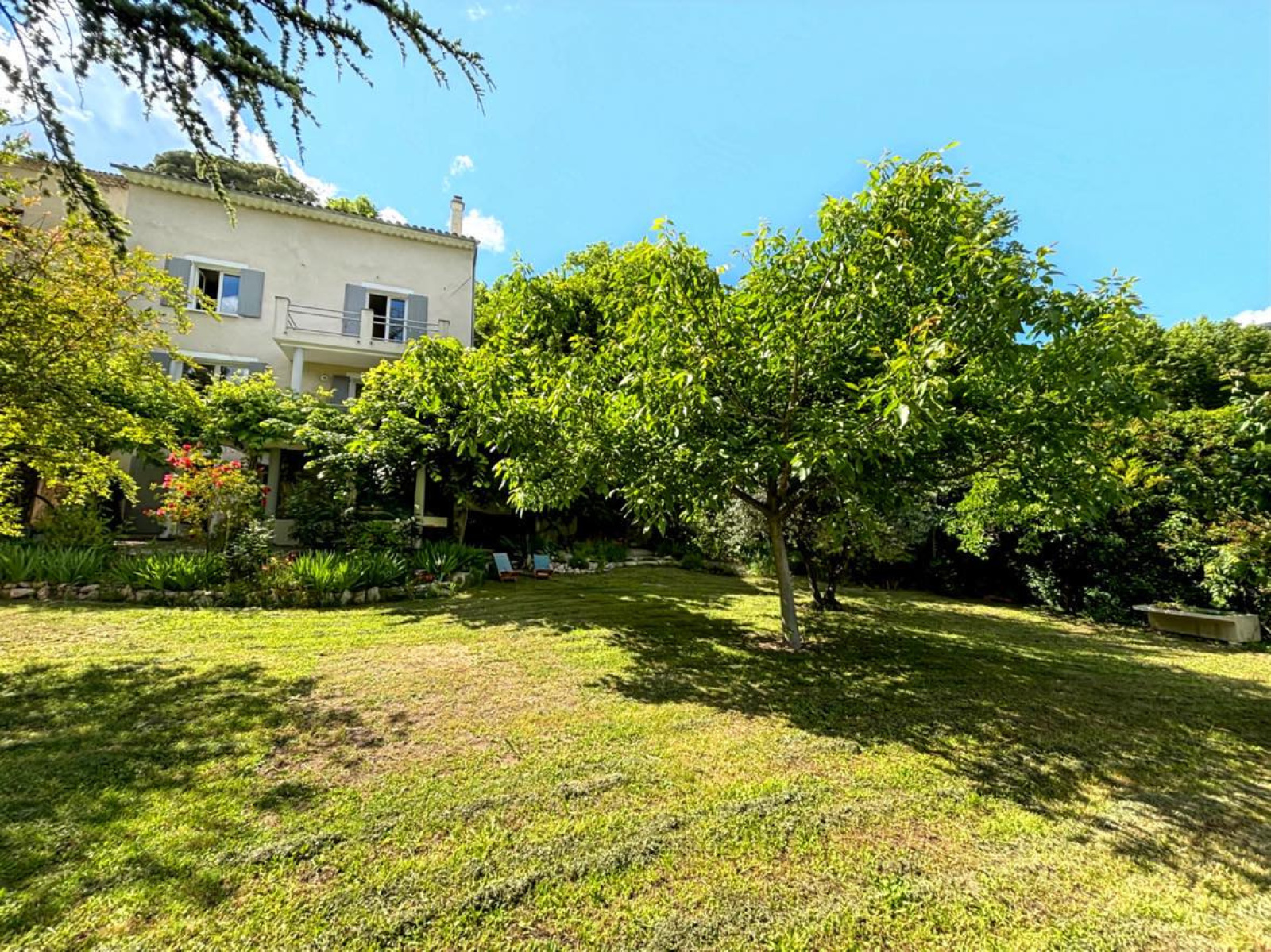 Magnifique jardin avec arbres fruitiers, puits et bassins.