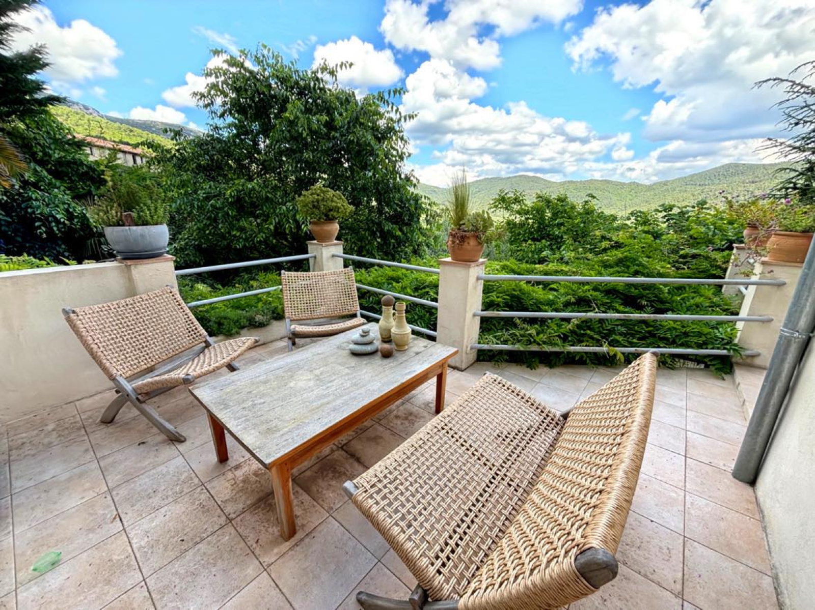 Elle est composée en rez-de-chaussée d'une belle entrée avec rangements, un double séjour, une cuisine entiérement refaite et équipée donnant sur une belle terrasse avec vue dominante, wc indépendant avec lave-mains.